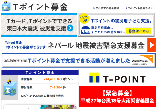 パソコン・スマートフォン・携帯電話の「Tポイント募金」サイト(http://tsite.jp/d/)の